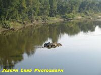 Long shot across Salt Creek showing remains of the bridge and the rails sticking out from the bank.