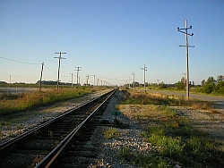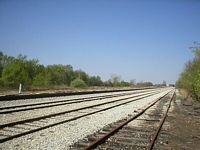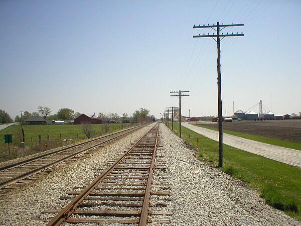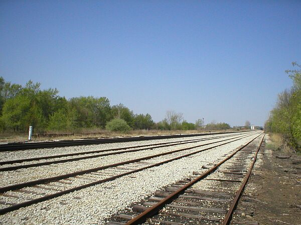 South Yard at Monon, 2004. Looking north from Quarry Road back towards town. Right: Looking south along the mainline. Off to the left of the image is the stone quarry and crusher.