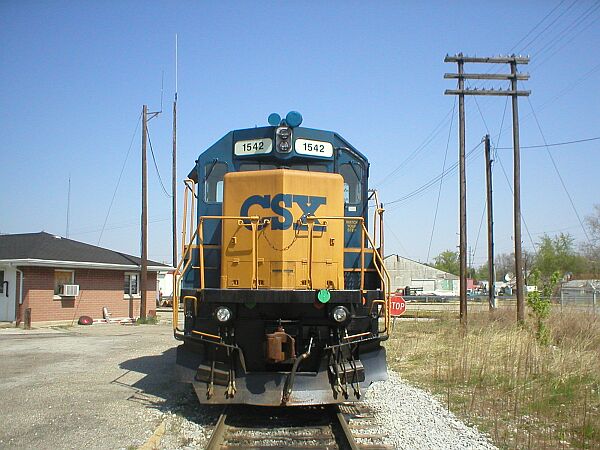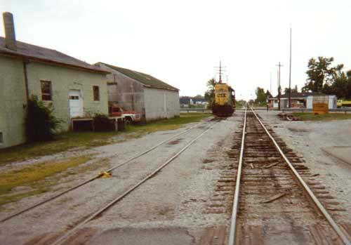 Monon Indiana, looking south towards the diamond and depot. CSX engine sits on the siding east of the main. Photo taken in August of 2001 by Mike Aufderheide, courtsey of Mike and Kevin Ruble.