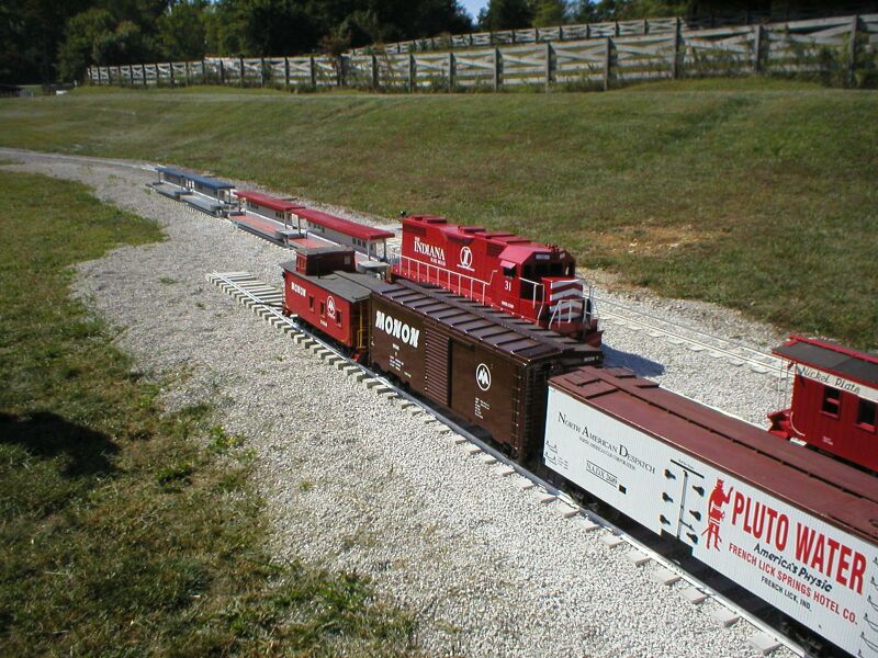 Another one bites the dust. A big "thank you' to all who attended this year's convention. A splendid time was had by all. Additional photos and stories to be added soon. A special thanks to Joseph Novosel Jr. for providing the Live Pictures during the weekend. New Unionville & Western Railroad (aka Pete's Playland.) Tom Kepshire Photographs Left: Panoramic view of some Monon rolling stock. Oh yes, and a Pluto car. Right: Joe Land and wife check out the yard and the Monon consist that waits for motive power. Left and Right: Van Bree's favorite car. Left: Monon steam power getting ready at the roundhouse. Right: Mike Albert checks out a string of hopper cars. He was the first to nit pick about rivets or something like that. Left: Dead Eye Steve Stafford arrives at Pete's. He heard Heggi was expected, so he had the Hovercraft locked down tight. Right: Pete Pedigo gets ready to move out some clean motive power in anticipation of the group's arrival. Left: Pluto Water car, Monon Box car 1 and caboose await motive power. Right: Society members arrive. Justin Asbery Photographs Left: Steam locomotive 561 passes with a freight. Right: Another group pulling out of the station. Tour guide telling the history of the quarry and general instructions.. Joe Land Photographs Left: Pete communicates with all the trains prior to the arrival of the tour. Right: Pete explains the history of his empire and gives instructions. Left: "Okay, if we are all clear on how we operate, lets have some people get on board." Right: One of the freights pass in review. Left: Cameras click off picture after picture as the train passes. Right: Pete's railroad is just like a real railroad. Passenger trains take the hole and wait for freights. Left: A Monon steam powered freight passes in review. That is real limestone in the gons people. Right: The guest are thrilled as the Monon freight passes. Left: A Nickel Plate ballast train passes. Right: Short coal drag also.