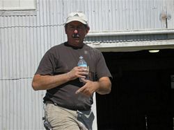 Left: "My fellow Americans....." President Van Bree always ready to deliver a speech. Right: Society members gather Saturday morning for the dedication of the Bloomington Monon Memorial. Left: "Okay, who left this tarp here? Okay, Ladies and Gentlemen, I declare this bridge open." George Carpenter unveils the memorial. Right: Tom Rankin returns George's wallet after the official dedication. Left: Former Monon employees in attendance pose with the memorial. Right" The crowd awaits the free beer that Van Bree promised. Left: The group is addressed at the Federal Cut Stone Company. Right: "Welcome to our little mill. Hope you enjoy the tour." Left: "Okay, can Kevin Heggi please step forward. We have been already briefed about you. Come on now, step forward." Right: Stone slabs at the mill await the next step. Left: Finished slabs wait. Right: Their pet hawk. Left: Radial saw makes short work of cutting the slab. Right: Nice statue. I wonder what a Frankie Monon would cost? Left: An employee works on a piece. Right: "Okay, that about does it. Okay guys, you can take the shackles off Mr. Heggi."