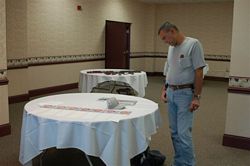Left: George Carpenter explains it all. Right: Ron Marquardt spinning some Monon stories. Left: Frank about to speak to the crowd. Right: The entrance to the Elliott underground quarry. Right: The unveiling of the memorial. Right: Inside the quarry. Right: "This place is BIG." Another shot inside the quarry. Right: After hearing about Heggi's reputation, the finishing mill hired a hawk to watch Heggi, like a hawk. Banquet Photos Warren Mitchell Photographs Left: Webmaster Tom Kepshire sitting among his many friends. Right: Joseph Novosel checks to make sure he captured the moment. Left: "Okay people, what is my opening bid on this reproduction Monon switch lock?" Right: Singing, or torture. It was a fine line. We all learned just what Fingers Marquardt and his piano means to Up and Down The Monon. L-R, Geoff Burns, Eric Powell, Frankie Monon and Ken Weller. Left: "Pam honey. Next year at Crawfordsville, lets spend the extra money and get the piano. My ears hurt." Right: By the seriousness on faces, must be Wheeler's Quiz From Hell time. Dan Seldin contemplates the questions. Left: Webmaster Tom Kepshire reacts to Mike Albert's comment. Mike was the 2008 winner of the Spike Award. Mike was chosen for being the first List Serve member to use a naughty word on the list, a REAL NAUGHTY "F" WORD. Rick Berg and Steve Moiser were presented the Golden Spike Award for their work on the Monon Route in Train Simulator. Neither was able to attend. Montford Switzer also received a Golden Spike Award for his work in modeling the Monon. Right: Time to play Stump The Former Monon Employees. When the scheduled guest speaker was unable to go due to an illness, several former Monon employees in attendance pitched in, stepped up and helped out. L-R, Ron Marquardt, Robert Wheeler, Robert Schultz, Dick Cantwell and Rick Driestadt. Left: Former Monon employee Frank Van Bree reminds the speakers that the Statute Of Limitations have expired, so go ahead tell all. Right: "You know, I really wanted to hit those cars. I've have said it was his fault, but I swerved the locomotive at the last second and got all of them. Just kidding." Left: "I am sorry, I refuse to answer that question on the grounds that it may incriminate me. Does anyone else have car repair questions?" Right: Some of the many items up for auction. Bruce Wolfe looks over some of the auction items.