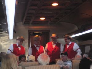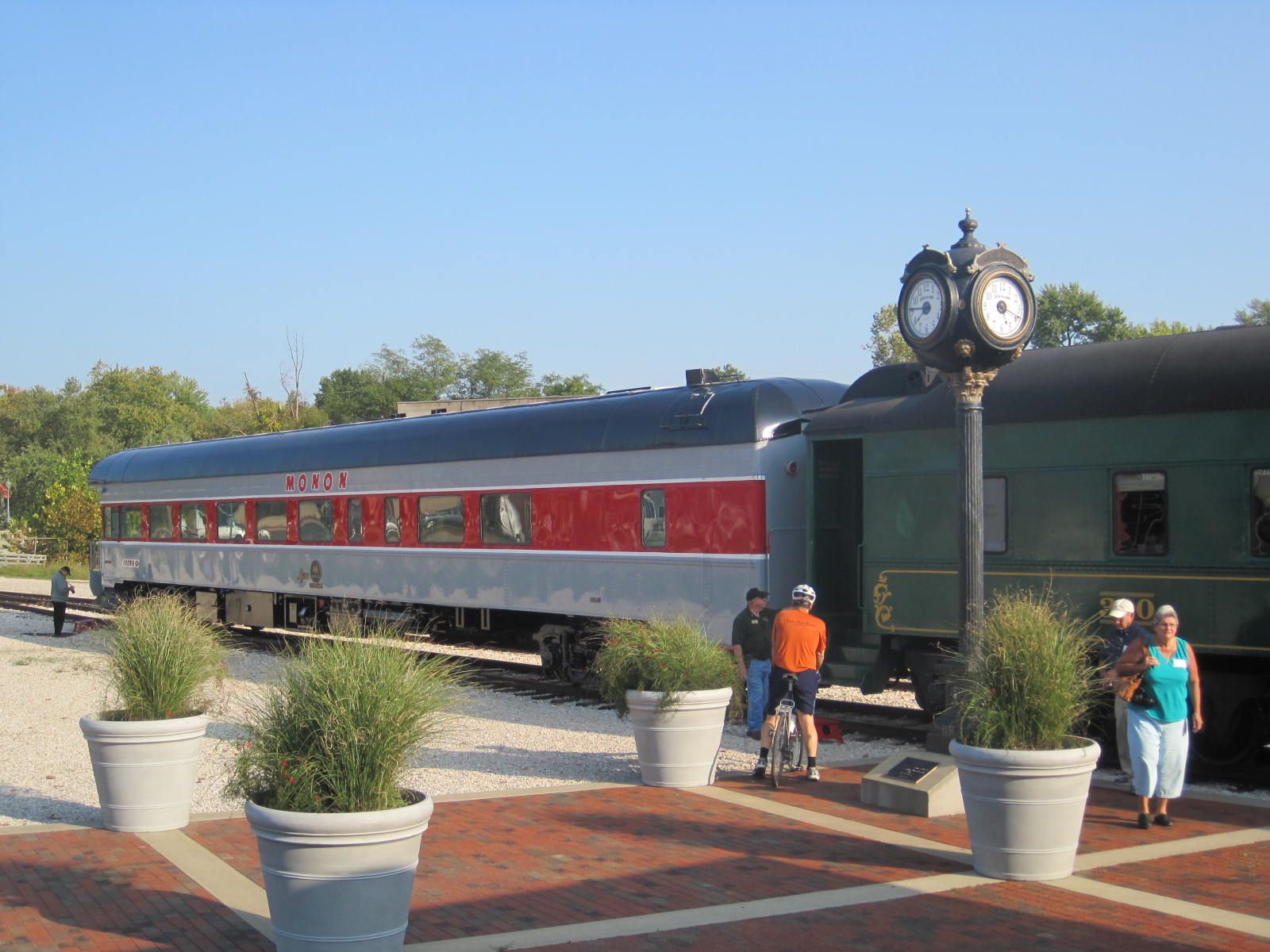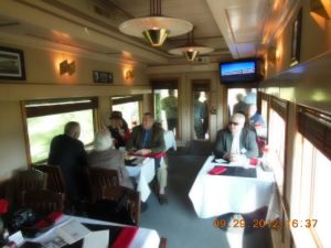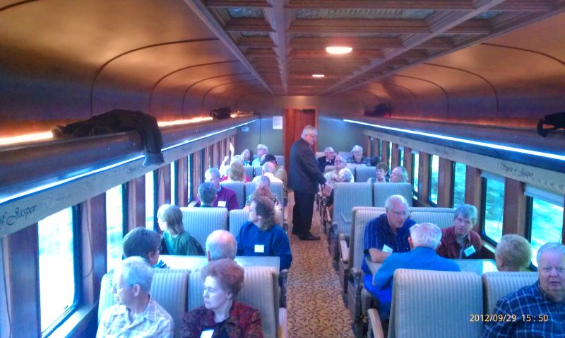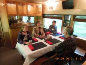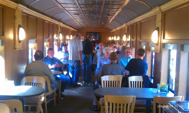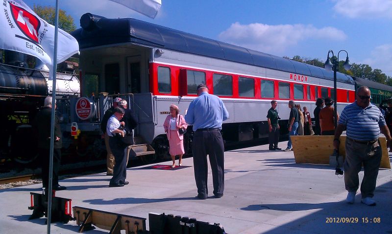 2012 Convention Images We hope to add photographs to this page as soon as they are submitted to the Webmaster. Photos courtesy of Kevin Heggi and Stew Windstanley Left and Right: Convention attendees wait at the French Lick Depot to board our Dinner Train. Left: Monon display at the depot. Right: The old girl with fresh makeup. She looks fantastic. Your Webmaster/ Director poses with Lynne. Left: Inside the 300 Dining Car. Right: The 200Dining Car. Looks like the people are really enjoying the trip. Left: The Jasper, Indiana depot. Right: Barbershop Quartet who entertained us during the trip. Chilling with the train crew in the Lounge Car after dinner. Left and Right: Dinners aboard the Lynne. Talk about riding and dining in style.. The Lynne at Jasper. Courtesy Of William "Sunny" Smith Left: End platform of the Lynne. Right: "Look Pete, I'm touching it." Left: The Smith's pose for the camera. Right: At Jasper. Left: "Up and Down The Monon" train guest are entertained by a Barber Shop Quartet. Courtesy of President Pete Pedigo Left: Kevin Heggi bellies up to the bar. Right: The new tables and chairs in the main salon. First class accommodations. Left: The tables await the passengers. Right: Replica set of china that will be sold by the Stores. Stay tuned for more details. Left and Right: Looks like they are having a good time. 10-07-2012 Courtesy of Robert Wheeler Left: Name plate on side of the Lynne. Right: The history of the car is on display. Left: The platform end of the Lynne. Right: She looks beautiful, doesn't she? Left: Lisa Nave on the Left and Marlee Franklin on the right. These cousins of Lynne Marie Chambers donated the original brass name plates of the Lynne back to the Society. Right: Pete Pedigo helps install the brass nameplates over the vinyl lettering. Left: The brass nameplates are finally installed. Right:The nameplate looks right at home. Left: The City of Jasper motive power at the French Lick depot. Right: Caboose 81531 at IRM. Please check back often.