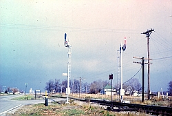 North end switch at Manchester. This was a spring switch in Monon days. Ron Marquardt, retired Monon Engineer, said he ran over it at speed with a loco that picked the points so it had to be rebuilt; spring switch was removed since the siding was little used by then. Prior to him crashing here, the switchstand would have had an S on it. Manchester mostly held cars to be sent to scrap. Photo was taken 11-25-1971. -Jim W Smith Photograph-