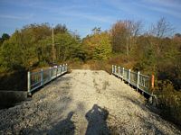 In 2006 the former right of way between the State Road 25 bridge and the Deer Creek bridge has been converted into a walking trail. The works continues on this trail but you can now walk from the Milroy Cabin site railroad south all the way to the High Bridge. Left: You are looking railroad south along the right of way from the south end of the SR 25 bridge. Right: Concrete signal base about 25 yards south of the SR 25 bridge.
