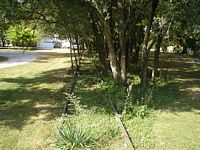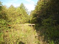 Looking along the former right of way railroad south. Note the embankment to the right side of the image. The Milroy Cabin site would also be to the right side of the image, on top of the embankment. Right: Obscured during our 2004 visit, I noticed this telegraph pole during some exploration of the embankment.