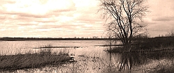 In those early days, about six sections of land in the southeast corner of Lake County were covered with timber, composed mostly of ash and elm, with some sycamore and gum trees, and with oak on the islands. The balance of these wetlands running west to the state line was open marsh, covered with heavy growth of wild grasses, wild rice, and flags. 'Flags' are varieties of plants with long sword-shaped leaves, including plants of the Iris family. Photo Right: The wide Kankakee at English Lake