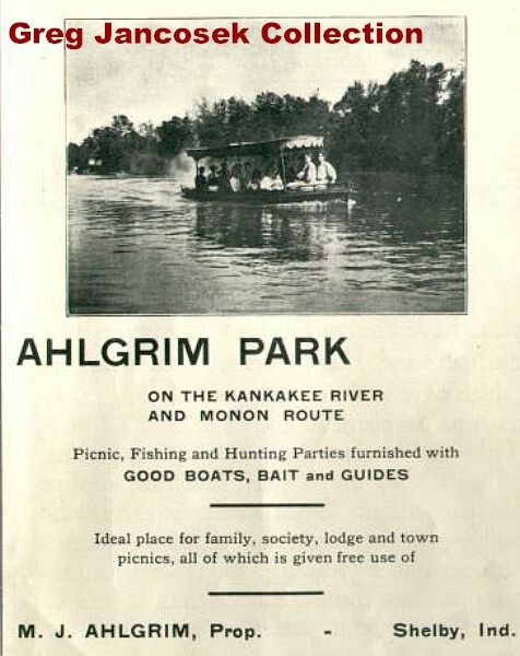 Max Ahlgrim arrived in the area about 1875. He built his frame home in Shelby soon after they moved in 1893, on the land known for years as "Ahlgrim's Park," where many came on the Monon Railroad to picnic. He also ran a small steamboat on the river, and would take sports enthusiasts to their favorite haunts in the Kankakee Valley.