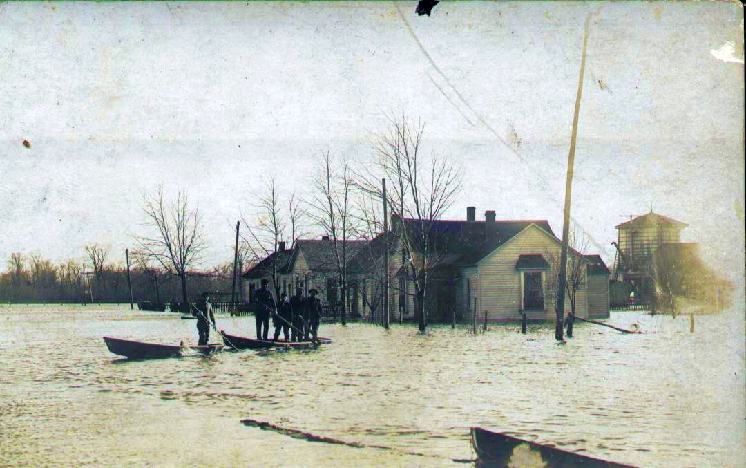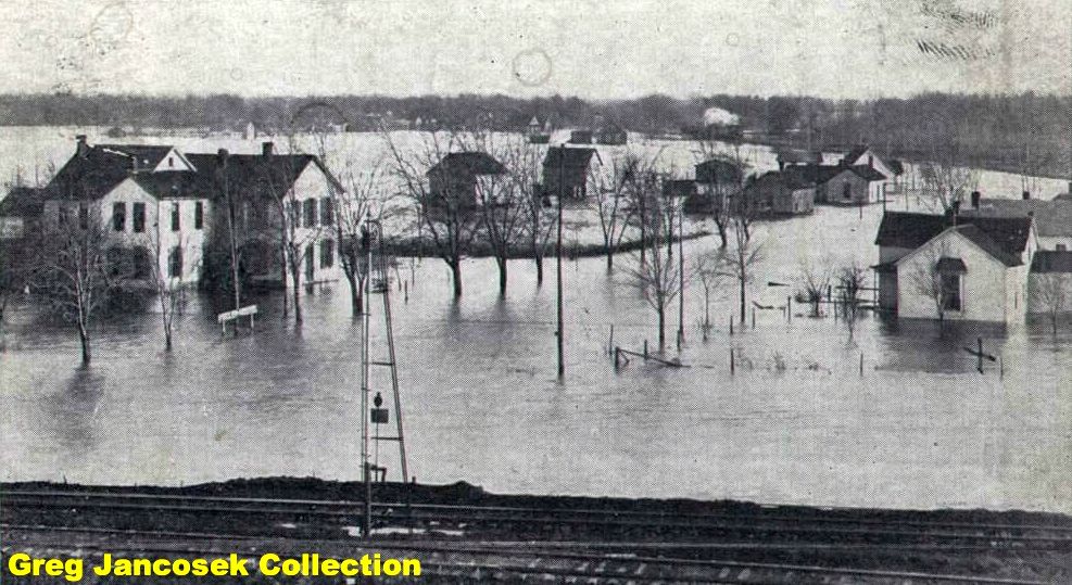 Photos (Left) Looking south toward the Kankakee at Shelby. The Fuller Hotel is pictured. Flood of 1908. (Right) Another shot from Shelby, 1908 Flood. -Greg Jancosek Collection-
