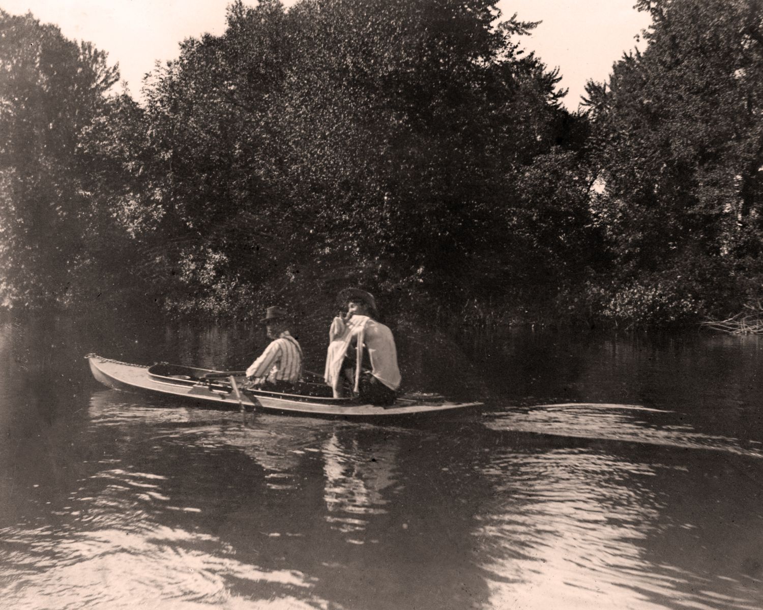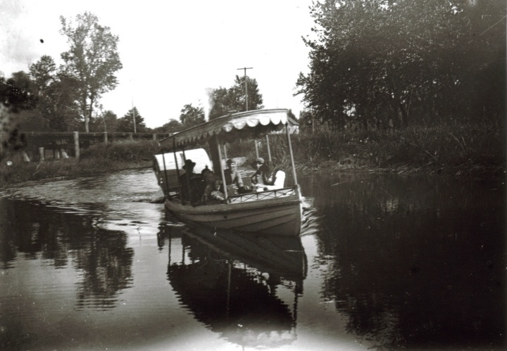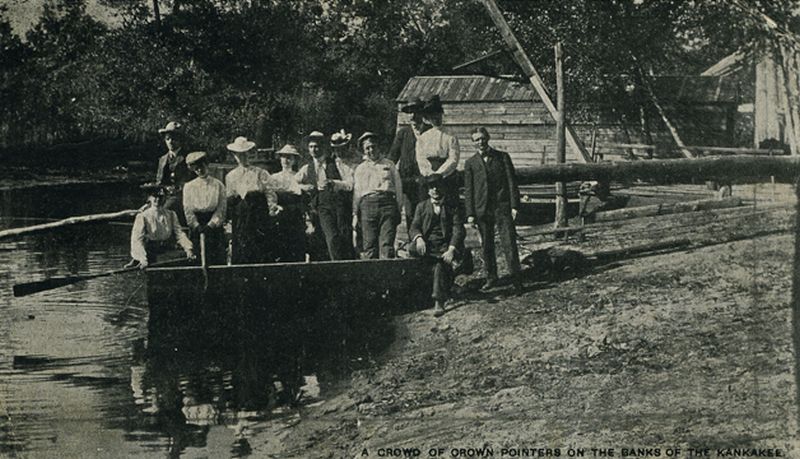 Photos (Left) Group of Crown Point residents ready to enjoy a day on the river. Northwest Indiana Genealogical Society Collection- (Right) Powered launch out of the river. -Marc Buhurmester Collection-