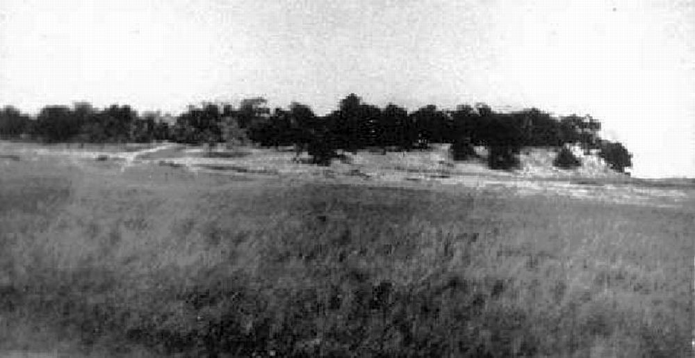 South of the Kankakee River, the marsh continued, One of the most prominent features was once the 36,000 acre Beaver Lake, near Lake Village. It was a large area of clear open water dotted by islands, the largest known as Bogus Island, capped with large oak and hickory trees. The south shore had many arms and inlets, with sandy beaches sloping to the water's edge. Bogus Island was the hideout of horse thieves and counterfeiters between the years 1837 to 1858. In 1873 Beaver Lake was drained and reclaimed as farm land. Photo Right: Bogus Island, 1930 after Beaver Lake was drained. -Newton County Historical Society-