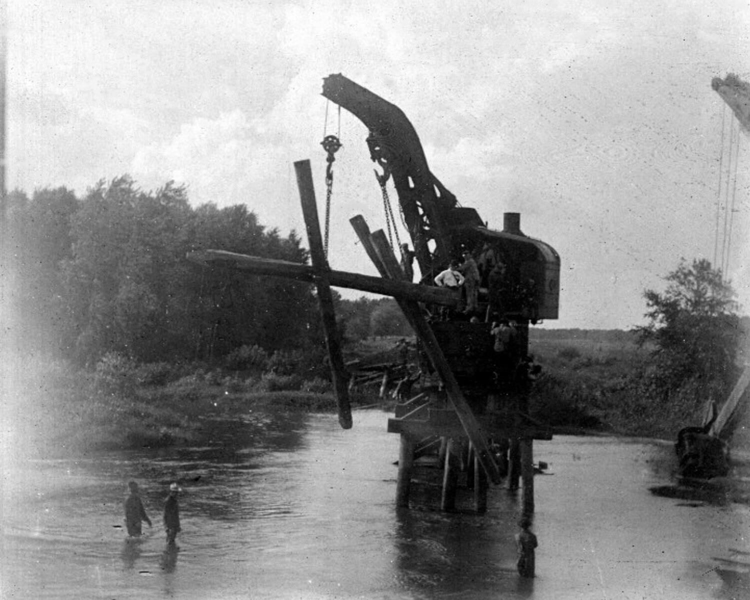 Photo Left: Removing the original wooden trestle at English Lake. This is around the time the river was being dredged. Note dredge to the right. -Starke County Historical Society-