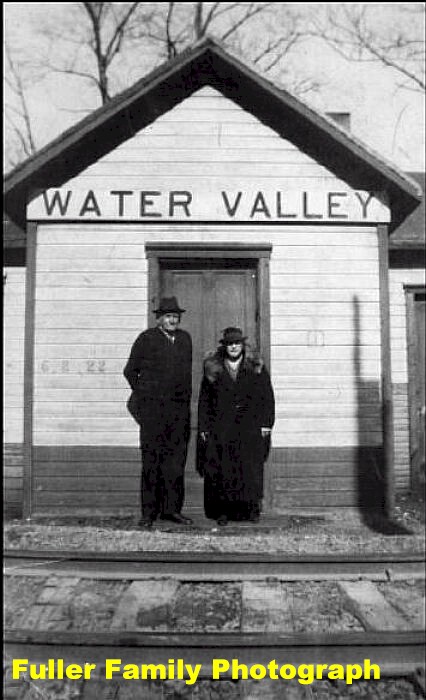 Photos: (Left) The Water Valley depot. This building was once the depot. When this photo was taken, the building was used for some other purpose. The siding to the left was a team track and the one to the right was used to deliver coal for the pump house and lodges. -Marc Buhurmester Collection- (Right) The Fuller's pose in front of the Water Valley depot. -Fuller Family Photographs-