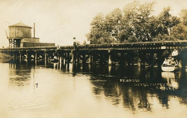 Photo Left: The trestle at Riverside. Although labeled as Dunn's Resort, after investigation, this is the Monon bridge at Riverside. The hotels and clubs here were all north of the river. When the river was channelized, this location was not changed. You can still see the original channel north of the present channel. -Indiana Historical Society Collection-