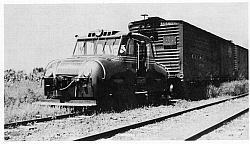 Photos: Another of the unique CAS internal combustion motive power. Evans Auto Railer M-2. Right: M-2 with freights cars. Unknown location. Louis W. Schaller photos.