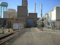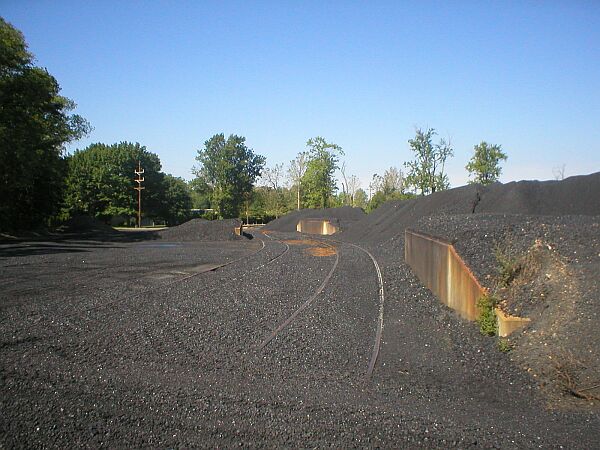 Left: And, speaking of the coal storage area. Since many of the crossings have been paved over between Washington Street and this location, one must presume that coal now arrives by truck and is loaded into the hoppers and moved to the Power Station. Right: The end of the line, the Power Station.