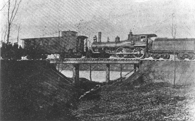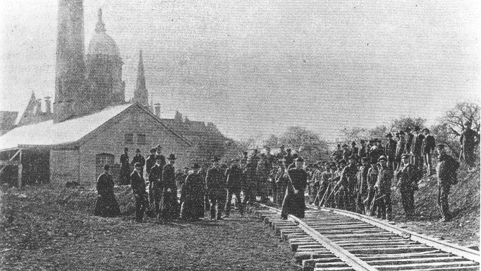 Left: Track laying on the ND&W RR. Date unknown. The location appears to be close to where the Power Plant tracks cross Douglas Road today. Right: Steam engine and caboose operate somewhere on the ND&W RR. Date and location of photo unknown.