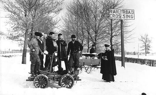 Left: Gondola cars on the ND&W RR. Date and location unknown at present. Right: Students take a hand car for a ride. Date unknown, however based on the clothes, I would guess early 1900's. Location unknown at present.