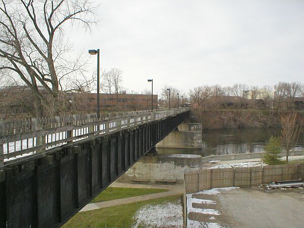 Left: Northern Indiana Railroad, crossing the St. Joseph River, June 15, 1940. This car is westbound crossing the old Grand Trunk bridge. This was the last run of this line. The next day, bus service was initiated in South Bend, by Transpo. Right: Same bridge, slightly different angle. Now it is part of the East Race walking trail. Note the concrete bridge piers. They were built for a double track bridge, however, it appears that the GTW never built the second bridge.
