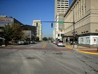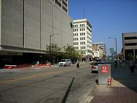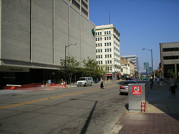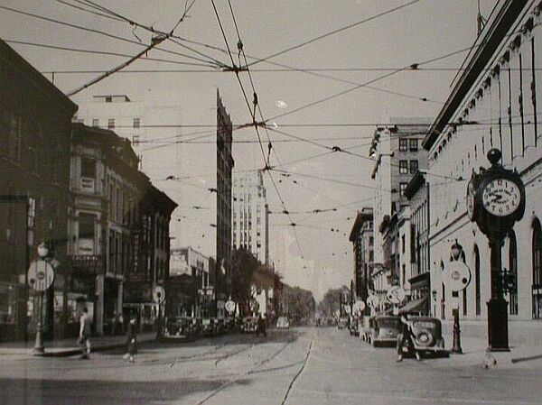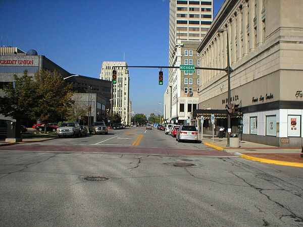 Left: Downtown South Bend, date unknown. NIRR Bendix line. This picture is looking west from Michigan Street and down Washington Street. Building in the background on the left is the Tower Building. On the right, the Oliver Hotel. Right: Downtown circa 2003.