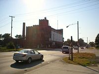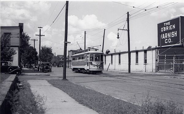 Left: Northern Indiana Railroad, Bendix Line, August 13, 1938. This car is eastbound on Washington Street. In the background is the O'Brien Varnish Company, later known as Fuller O'Brien Paint Company. M.D. McCarter Photograph. Right: Same location, circa 2003. Uniroyal Sealants calls the former O'Brien Varnish Company home.