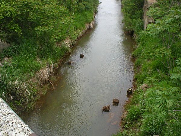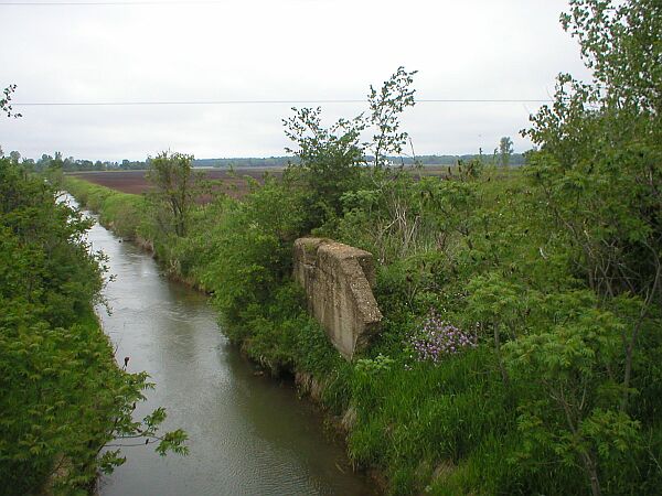 Left and Right: The old Northern Indiana Railway, west of Lydick, Indiana. Pictured on the left are all that remains of a former bridge along the NIRR. Bridge abutment on the east bank and old pilings in the creek. From this point the line ran parallel to the South Shore through New Carlisle, turned south and ended up in LaPorte.This