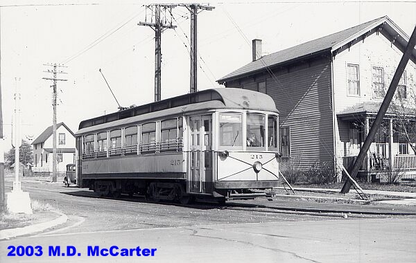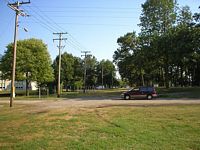 Left: Northern Indiana Railroad, Bendix Line, August 18, 1938. Car 215 is approaching the South Shore line at Meade and Orange Streets. This car is southbound. M.D. McCarter Photograph. Right: Same location, circa 2003.