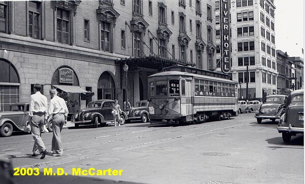 Left: Northern Indiana Railroad, Bendix Line, August 18, 1938. This car is westbound on Washington Street. In the background is the former Oliver Hotel, which was once the "best place in town." Also in the background, across the street is the JMS (John M. Studebaker) Building. M.D. McCarter Photograph. Right: Same location, circa 2003. Today City Center occupies the corner.