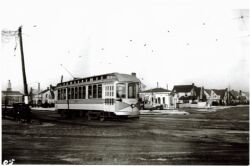 Left: Motor Car #205 making its way past the Playland Public Market, Ironwood and Lincolnway East. Today, a Walgreens is replacing Don Meadow Pontiac. Right: This one was slightly harder to identify. The steeple in the left corner of the photo helped narrow down the location. That building is Thomas Jefferson school. The motor car is southbound on Eddy Street and the gas station pictured was on the corner of Eddy and Mishawaka Ave. Belmont Street runs east, north of the gas station. The houses pictured all still exist.