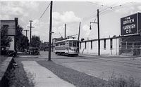 Left: Northern Indiana Railroad, Lincolnway West Line, August 13, 1938. This car is eastbound on Lincolnway West, just about to cross the New York Central line which passed St. Mary's College and The University of Notre Dame. In the background is the Hoosier Brewery. M.D. McCarter Photograph. Right: Same location, circa 2003. Lincolnway West is still a busy street.