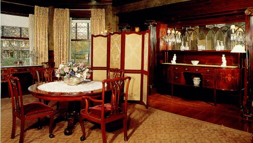 The dinning room is another room that is just magnificent. Adorned in mahogany with fluted ionic columns flanking the fireplace. The door to the Butler's Pantry and Kitchen is concealed by the 5 panel screen.