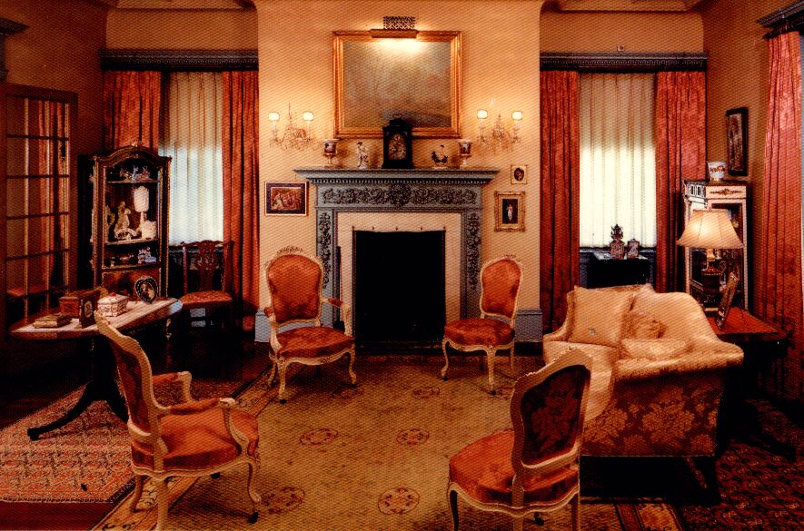 This is the French Mourning Room, or Parlor. The room recalls an era when ladies in long gowns stopped by to pay an afternoon call. Two of the more striking features, the carved plaster ceiling and the mahogany floor.