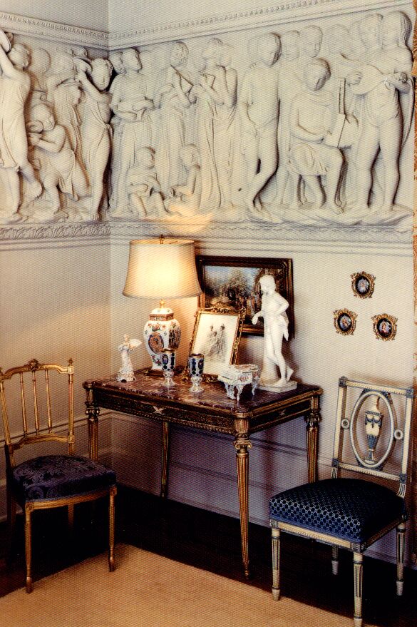 The Music Room was added to Copshaholm in 1899, when the south terrace was enclosed. The plaster figures that encircle the room are a copy of a freize based on the 150th Psalm, designed by Luca Della Robbia for the Duomo Cathedral in Florence, Italy. The Steinway grand piano dates back to the 1930's.