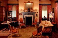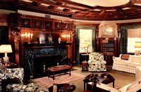 This is the Library. The imposing marble and mahogany fireplace dominate the west wall of the room. The ceiling adds a stately beauty of the room, which is furnished with overstuffed chairs and occasional tables.