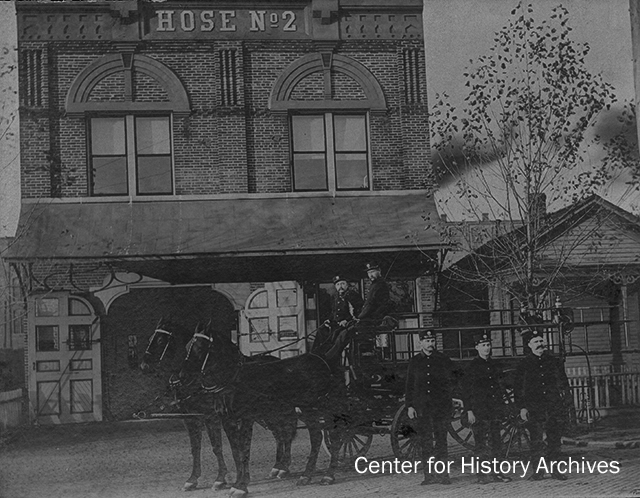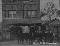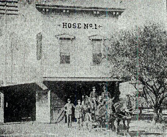Left: Pictured is the first building which house paid fire company #1. It was located on the north side of LaSalle Avenue, west of Michigan Street. For a while, the downtown South Shore railroad station stood on the location. (South Bend Tribune photo.) Right: Hose Company #2, 1901