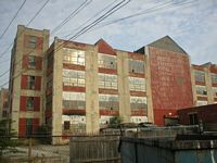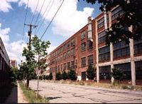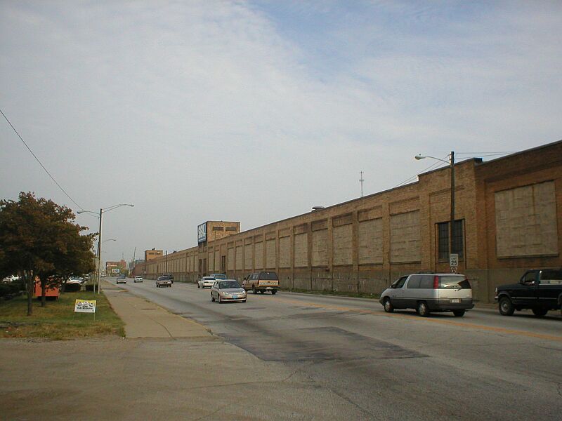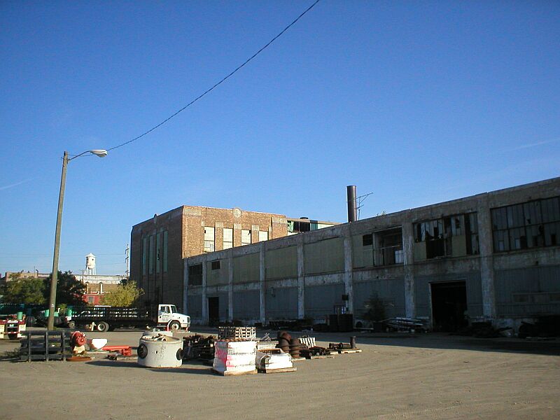 Studebaker Corporation Building 113 (1946). Paint lab and body parts sub-assembly. South facade of the building, looking northwest from Lafayette Street.