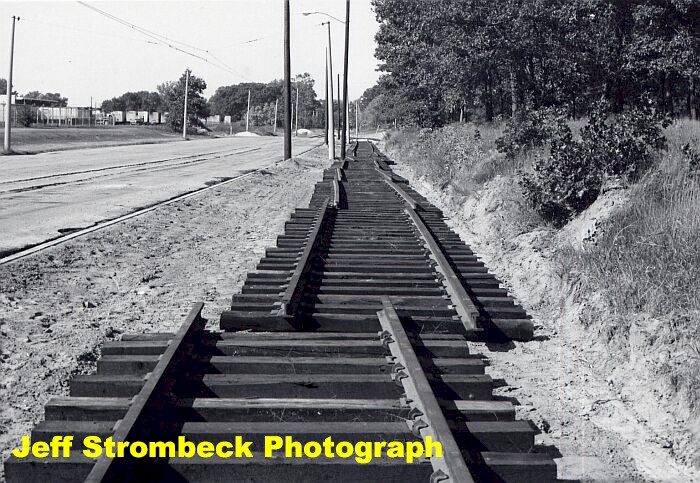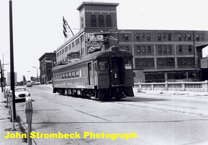 Left: Prototype sectional track. The year is 1975 and the sections of track have been set along Westmoor. Soon the line relocation a few feet north would eliminate the street running along Bendix and Westmoor. Right: August 1962 and car # 105 cruises down LaSalle Street. The depot can be seen in the distance.