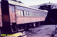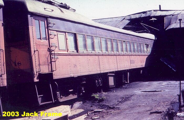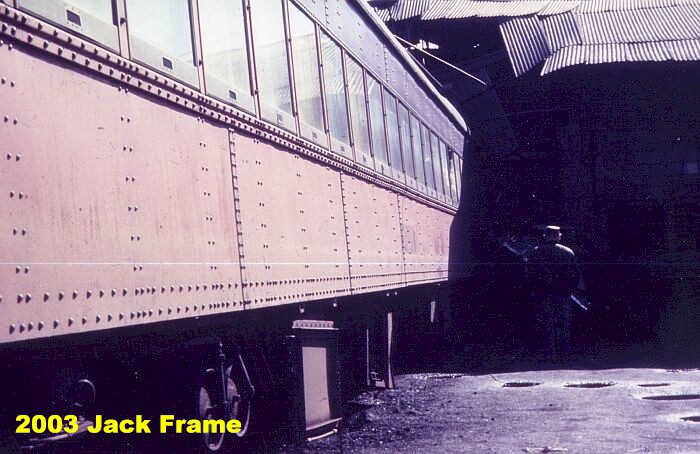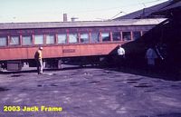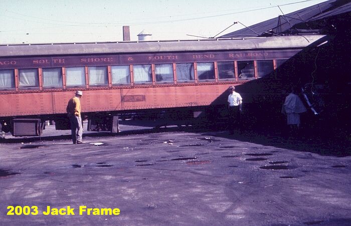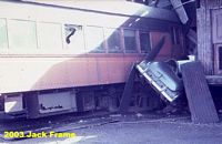 These four images are of an accident that happened in South Bend at 7:10pm, April 14, 1967. A week later, April 21, 1967 at 3:00am another accident occurred in the same general area involving a single unit train. Car #18 was eastbound when somewhere around Bendix the train lost both power and brakes. The train, Motorman Lloyd Powers at the controls, was unable to stop. Striking several automobiles and one truck during the journey and injuring 9 people, including Powers, the train slammed into the loading dock and storage building of LaSalle Salvage Company, 311 E. LaSalle. Motorman Powers was found 120 feet west of the final resting place of the car. He jumped from the run away train and broke both legs and numerous other injuries. The automobile pictured, a Studebaker, was one that was there to be salvaged. A week later, April 21, 1967, another one car train lost it brakes at College Street and rolled all the way to the yard at Lasalle and Hydraulic Street. It crashed through a barrier, took out a utility pole and through an earthen embankment. Although incidents of brake failure were rare, it ended the South Shore's experiment with one coach trains. These images are courtsey of Jack Frame of Raleigh, North Carolina.