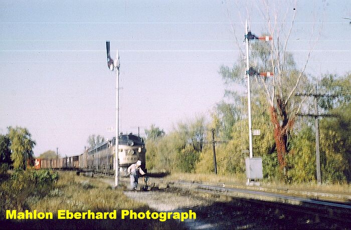 Left: Train #5 arriving at Monon Indiana. Hap Meridith is handing up the