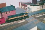 BL2 #36 (Proto 2000) approaching Monon with a short local. Tom Kepshires 16 x 10 feet, L-shaped shelf layout depicting the town of Monon, Indiana.