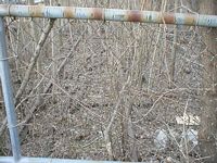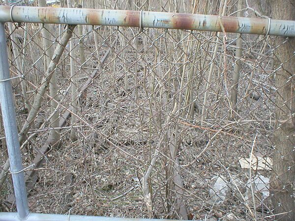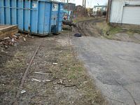 December 31, 2003. Left: Look close and you can see what remains of the Indiana Northern spur that once serviced Wilson Brothers Shirt Company. These tracks are located on the south side of Werntz Supply and you are looking west in this photo. The Indiana Northern once made a sweeping "S" curve through the property now owned by the salvage company. Right: Looking back to the east from the fence, pictured to the left. Note rail which is still in place along the south side of Werntz Supply.