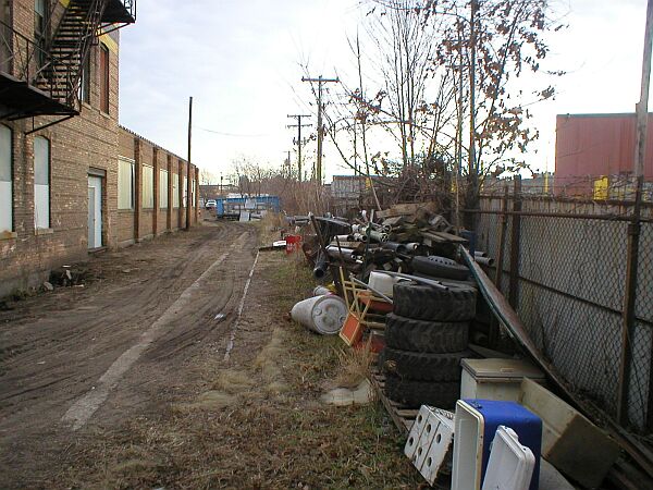 December 31, 2003. Left: Another view of what remains of the Indiana Northern spur that once serviced the plant. You are looking to the north, between buildings. Right: This pictures was taken from between the buildings and you are looking back to the south. I would like to express my sincere thanks to Mr. Werntz, of Werntz Supply, for allowing me to photograph on the company property.