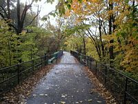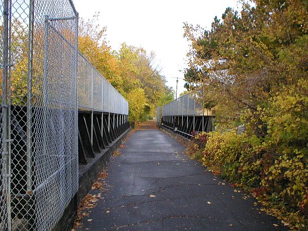 Left: October 2003. Michigan Street bridge, looking to the north. Right: Leeper Street bridge, October 26, 2003. Looking to the north. Bottom pictures: Today the former right of way is a walking trail. Left: Looking towards the northwest across the Michigan Street bridge. Right: Looking southeast across the Leeper Street bridge.