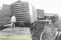 East of Walkerton, Indiana. February 3, 1962. A westbound freight hits another train just east of Walkerton. Four crewmen were injured. Left: NYC Alco FA2 # 1076 sits facing a crumpled boxcar. The remains of the caboose are pictured under the boxcar. Right: Damaged cars and track and spectators highlight another picture of the February 1962 wreck.
